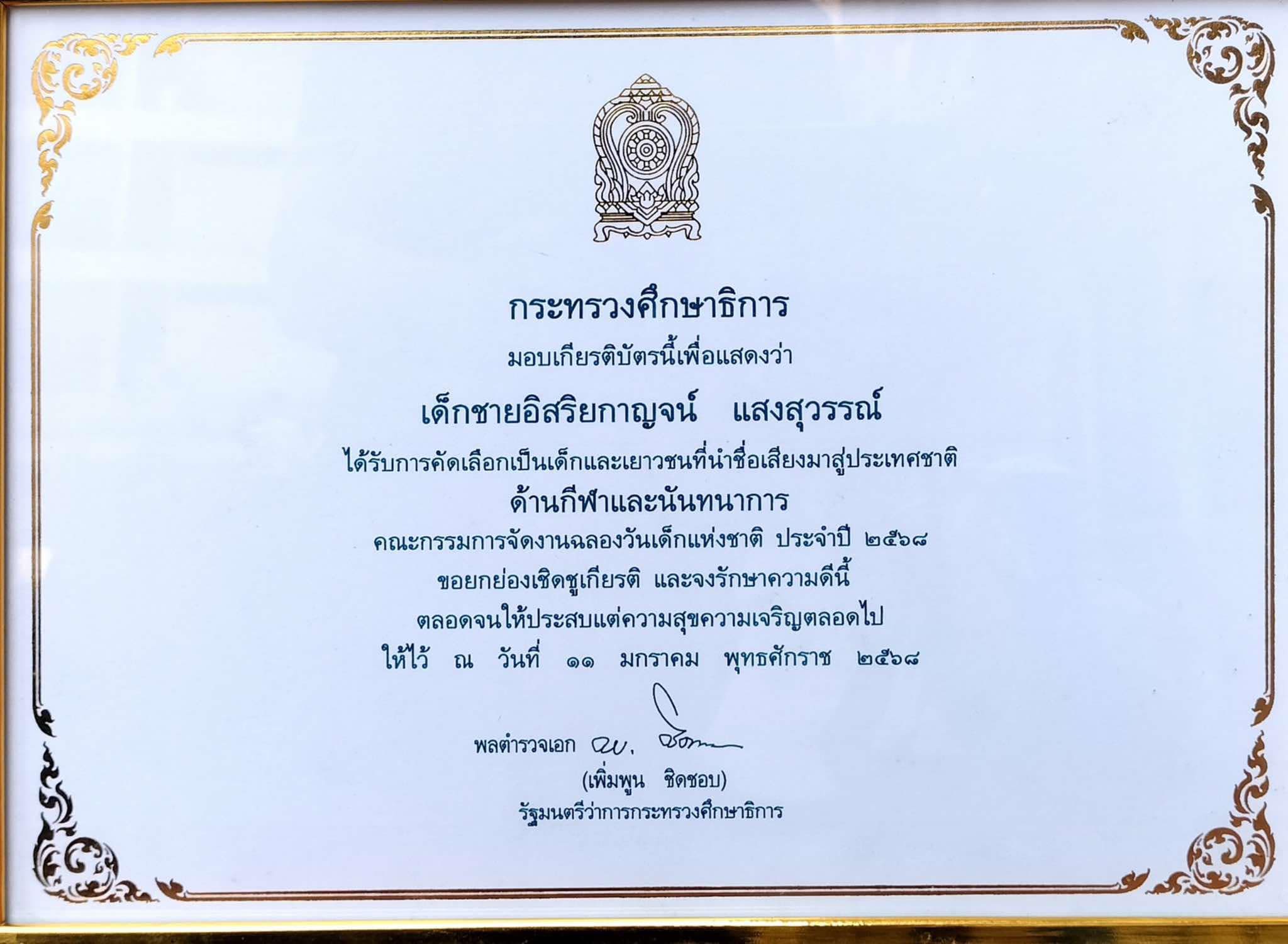 โรงเรียนรังษีวิทยาขอแสดงความยินดีกับ เด็กชายอิสริยกาญจน์ แสงสุวรรณ์ นักเรียนระดับชั้นประถมศึกษา 5/1 SMEP ได้รับรางวัลเด็กและเยาวชนที่นำชื่อเสียงมาสู่ประเทศชาติ ด้านกีฬาและนันทนาการ