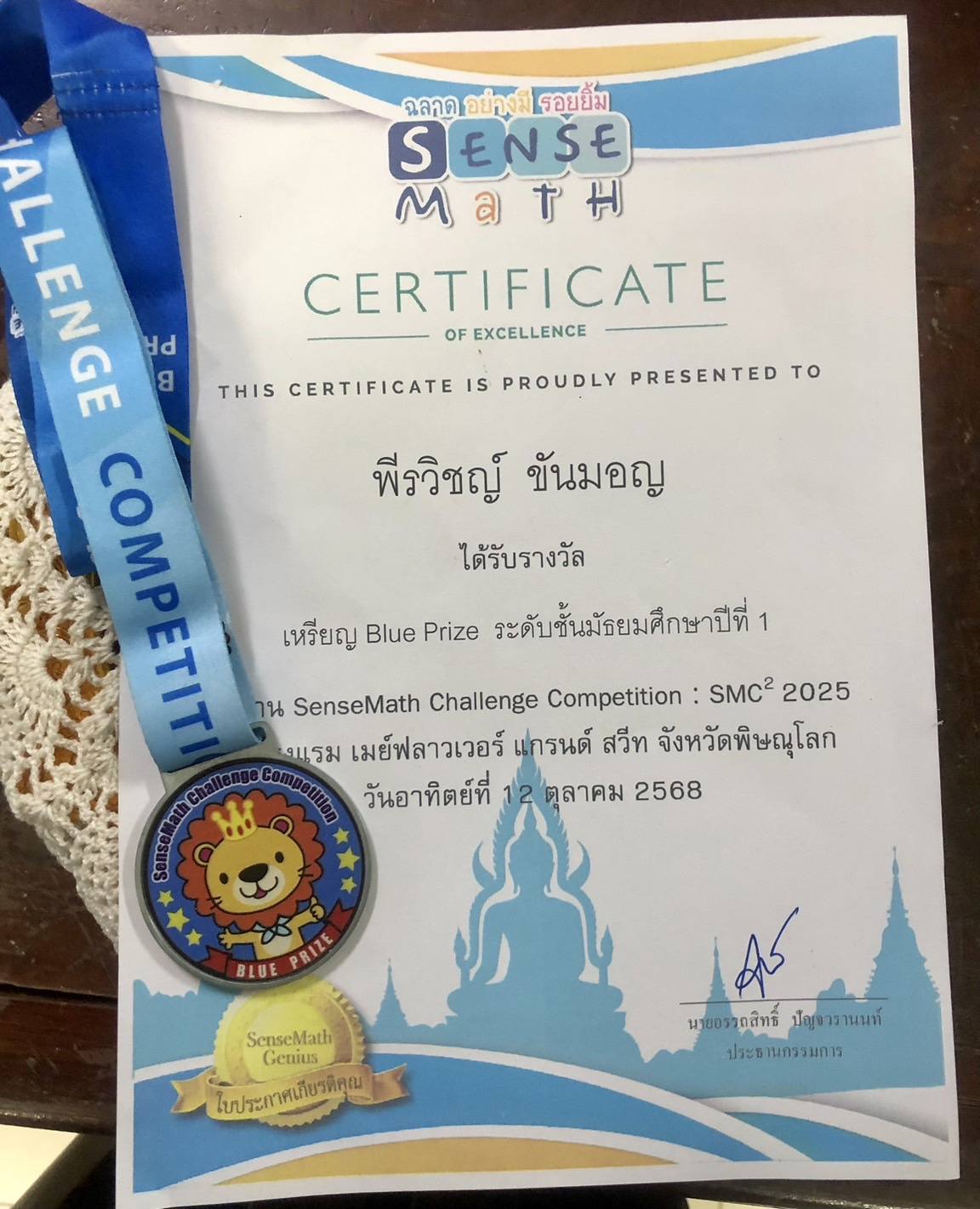 โรงเรียนรังษีวิทยา โดย ดร.อรวรรณ กัลชาญพิเศษ ผู้อำนวยการ มอบเกียรติบัตรร่วมแสดงความยินดีกับ เด็กชายพีรวิชญ์ ขันมอญ ที่ได้รางวัลเหรียญ Blue Prize ระดับชั้นมัธยมศึกษาปีที่ 1 งาน SenseMath Challenge Competition (SMC) : SMC 2025 รอบที่ 26 ณ โรงแรมเมย์ฟลาวเวอร์แกรนด์สวีท จ.พิษณุโลก