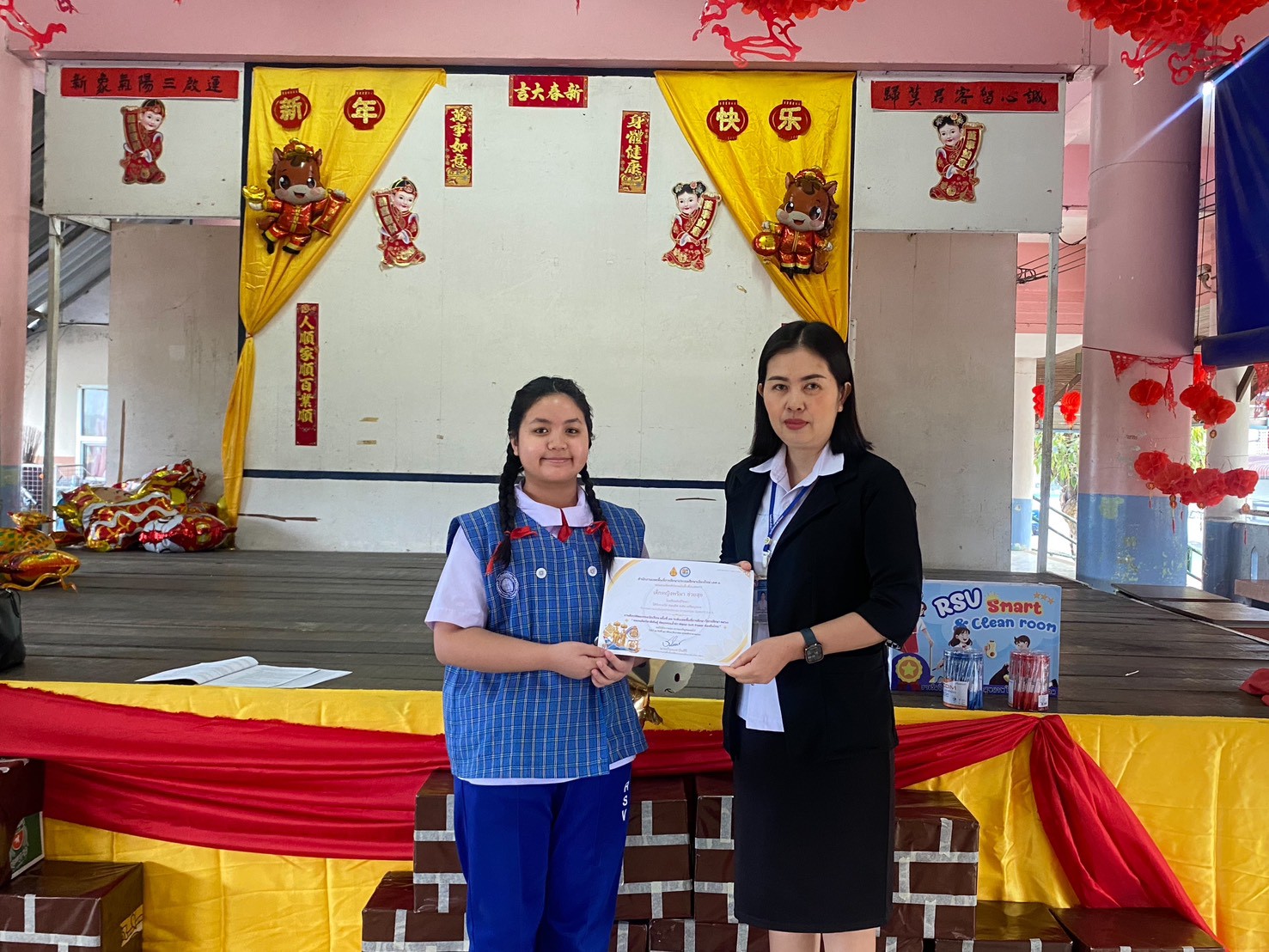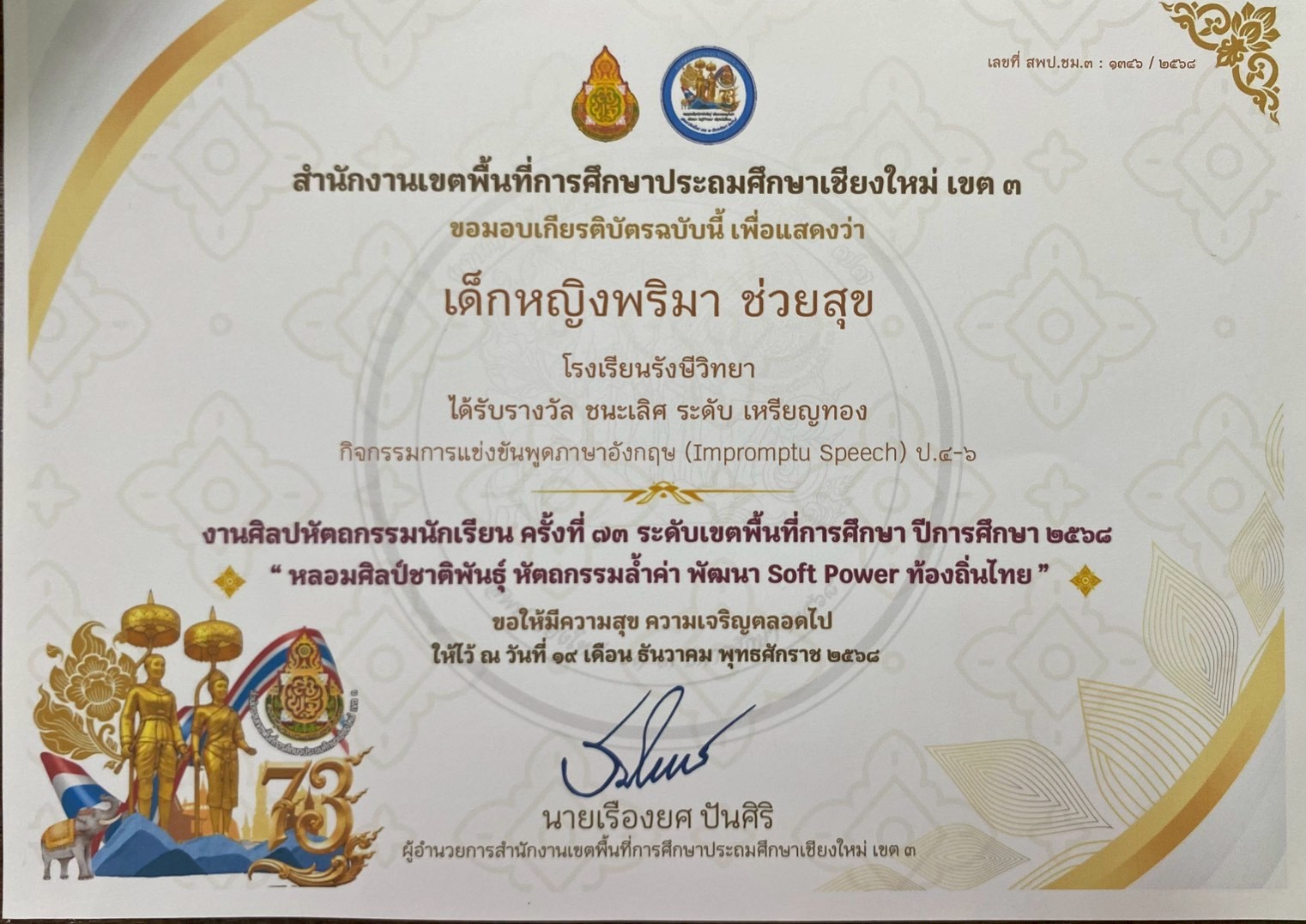 โรงเรียนรังษีวิทยา โดย อ.พัชรินทร์ สะอาดล้วน หัวหน้างานวิชาการระดับประถมศึกษา ขอแสดงความยินดีกับ เด็กหญิงพริมา ช่วยสุข นักเรียนชั้นประถมศึกษาปีที่ 5/1 ที่ได้รับรางวัลชนะเลิศ ระดับเหรียญทอง ในกิจกรรมการแข่งขันพูดภาษาอังกฤษ (Impromptu Speech) ป.4-6 งานศิลปหัตถกรรมนักเรียนครั้งที่ 73 ระดับเขตพื้นที่การศึกษา ปีการศึกษา 2568